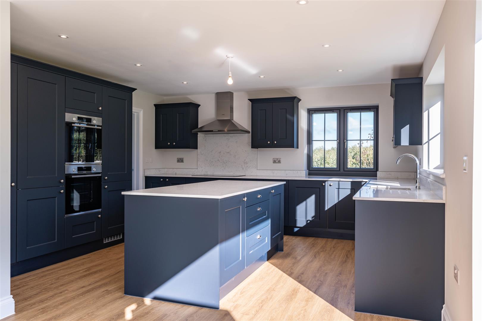 Perfect for entertaining, the shaker style kitchen by Gardiner of England consists of composite stone worktops with upstand & splashback and fully integrated Bosch appliances. These include two single ovens, a 5 ring induction hob, dishwasher, full height fridge and full height freezer. Other features include a 1.5 bowl sink with mixer tap, stainless steel extractor hood and LED under unit lighting.
