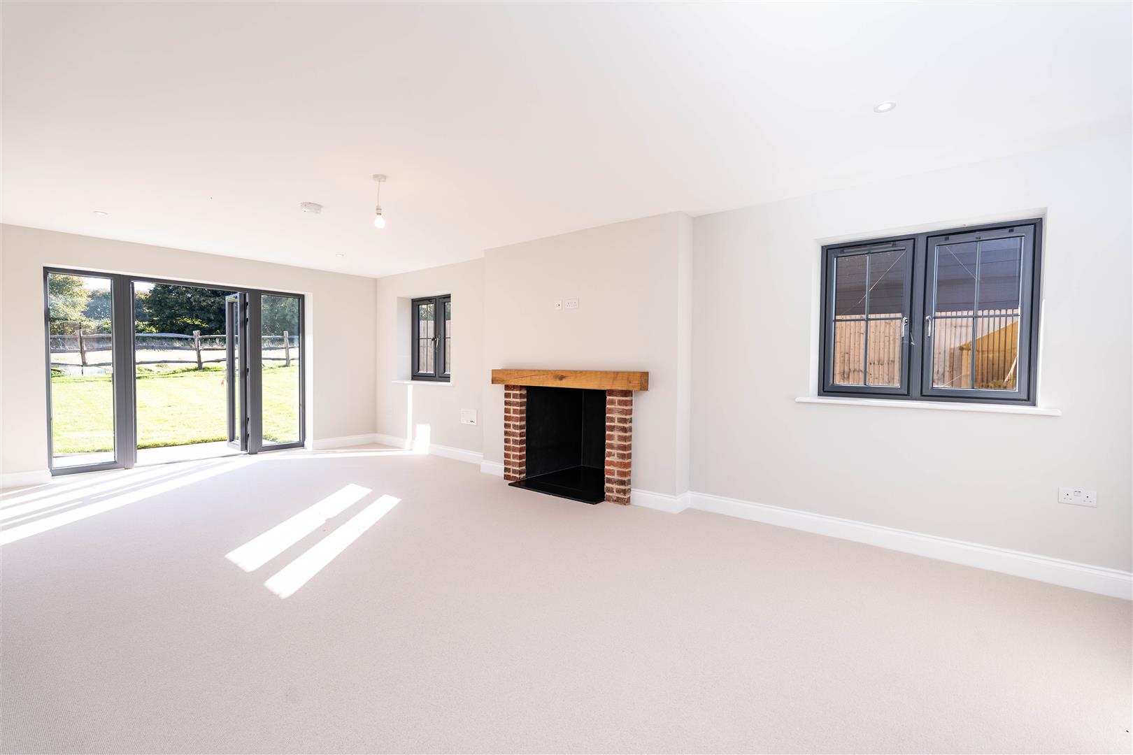 A triple aspect entertaining space with fireplace, constructed of brick surround and wooden bressummer beam over, which is capable of housing a log burner.
