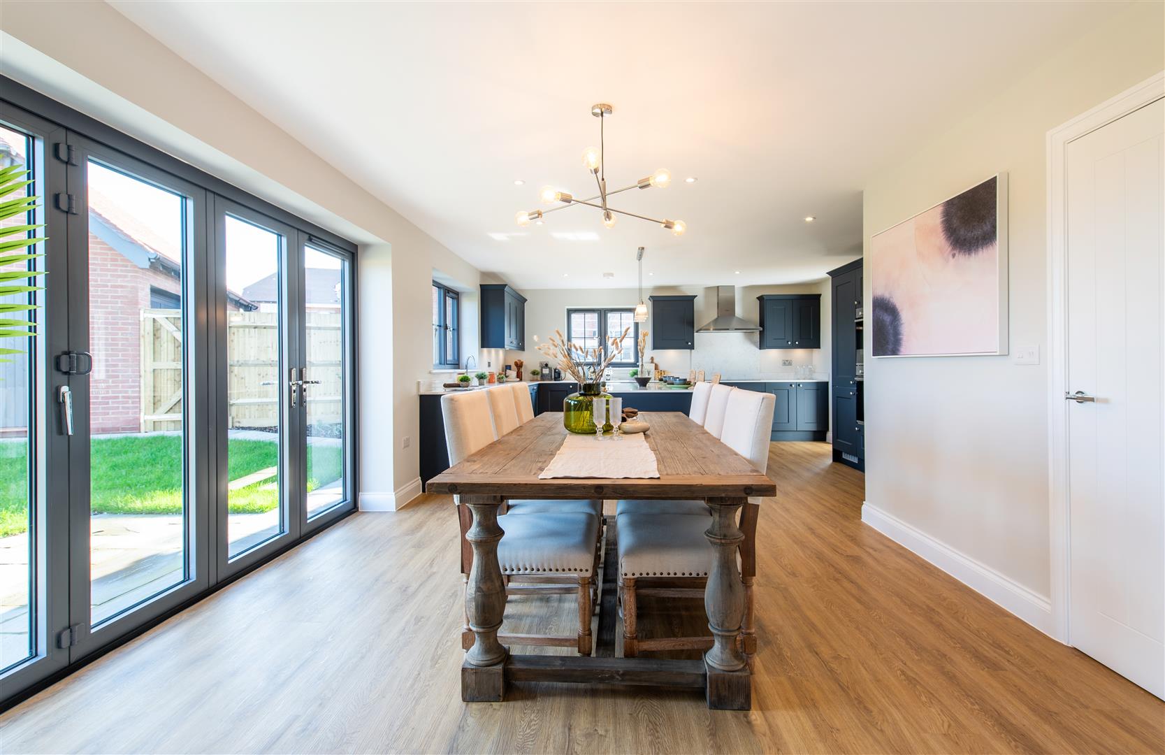 The dining area of the room benefits from bi-folding doors leading out to a grey Indian sandstone patio and turfed rear garden.