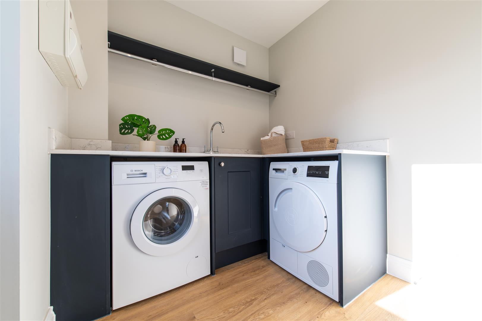 A practical room with external access. Key features include shaker style cabinets with shelf over, a sink with mixer tap, stone worktops & upstand and space for washing machine & tumble dryer.